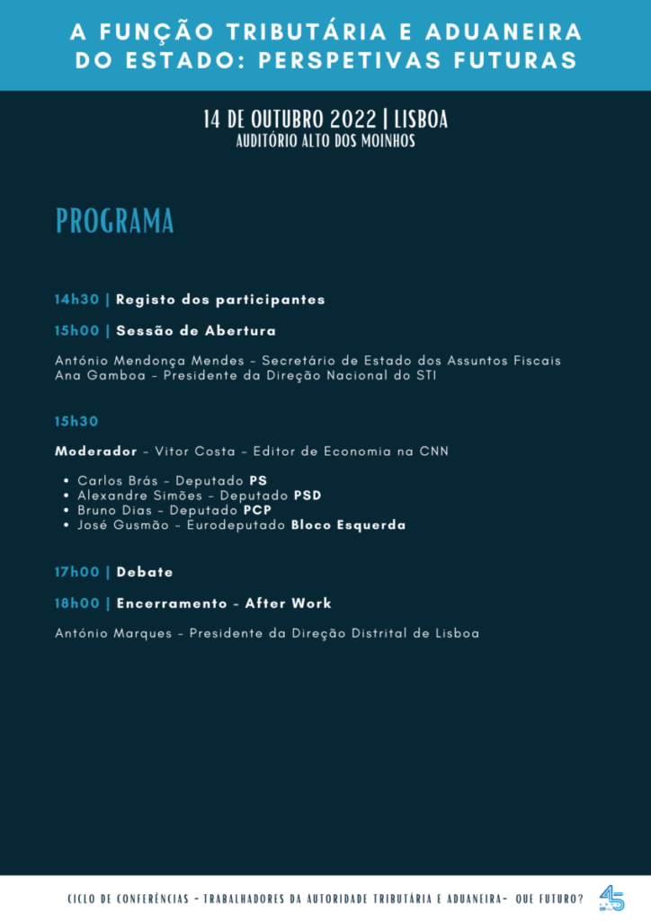 “A FUNÇÃO TRIBUTÁRIA E ADUANEIRA DO ESTADO: PERSPETIVAS FUTURAS” – 14/OUTUBRO | 14H30 – AUDITÓRIO DO ALTO DOS MOINHOS | LISBOA