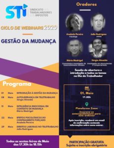 O Sindicato dos Trabalhadores dos Impostos (STI) vai realizar, através da plataforma ZOOM, o CICLO DE WEBINARS – GESTÃO DA MUDANÇA, durante o mês de maio, às sextas-feiras, das 17:30h às 18:15h.