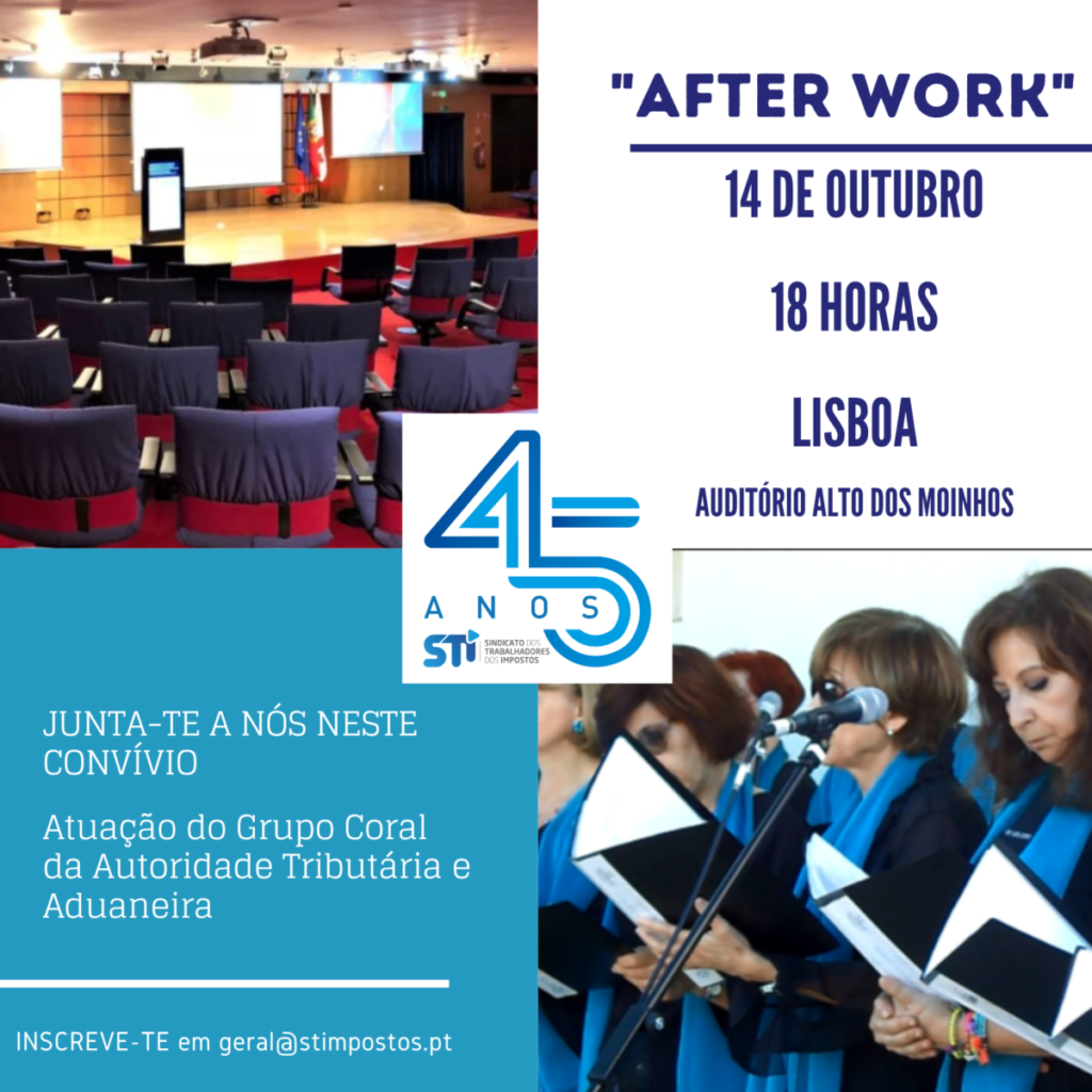 Este convívio contará com a atuação do Grupo Coral da Autoridade Tributária e Aduaneira e integra as comemorações do 45.º Aniversário do STI, realizando-se na sequência da conferência subordinada ao tema “A Função Tributária e Aduaneira do Estado”, a realizar no mesmo dia e local, estando aberto, não apenas aos participantes na conferência, mas a todos os colegas que, podendo, se queiram juntar, depois do trabalho.