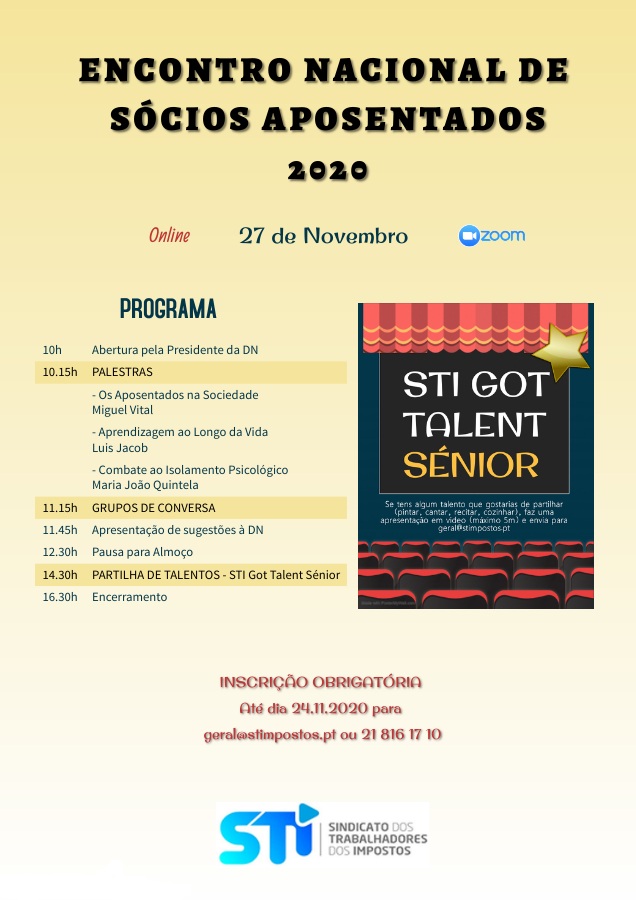 No próximo dia 27 de novembro (sexta-feira) realizar-se-á o Encontro Nacional de Sócios Aposentados 2020.