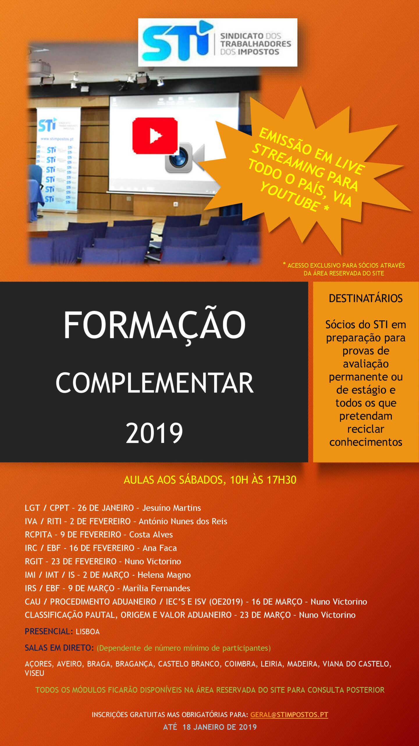 Para participar nas sessões de formação, presencial ou em sala com emissão direta, deverá preencher a Ficha de Inscrição infra e remetê-la até dia 18 de janeiro de 2019 para o email geral@stimpostos.pt, indicando as sessões e o local onde pretende assistir.