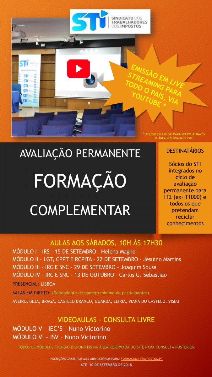 Para aceder aos conteúdos a disponibilizar no site do STI, poderá ir a www.stimpostos.pt, fazer o login na Área Reservada e, no menu lateral direito, selecionar “Ações de Formação”, clicando depois em FORMAÇÃO COMPLEMENTAR PARA AVALIAÇÃO PERMANENTE – IT1000, onde encontrará todo o material didático, bem como os vídeos e áudios das aulas.