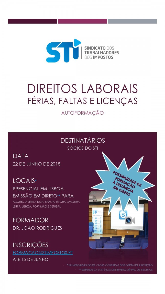 AÇÃO DE FORMAÇÃO "Direitos Laborais - Férias, Faltas e Licenças" DESTINATÁRIOS Todos os sócios do STI, com interesse no
