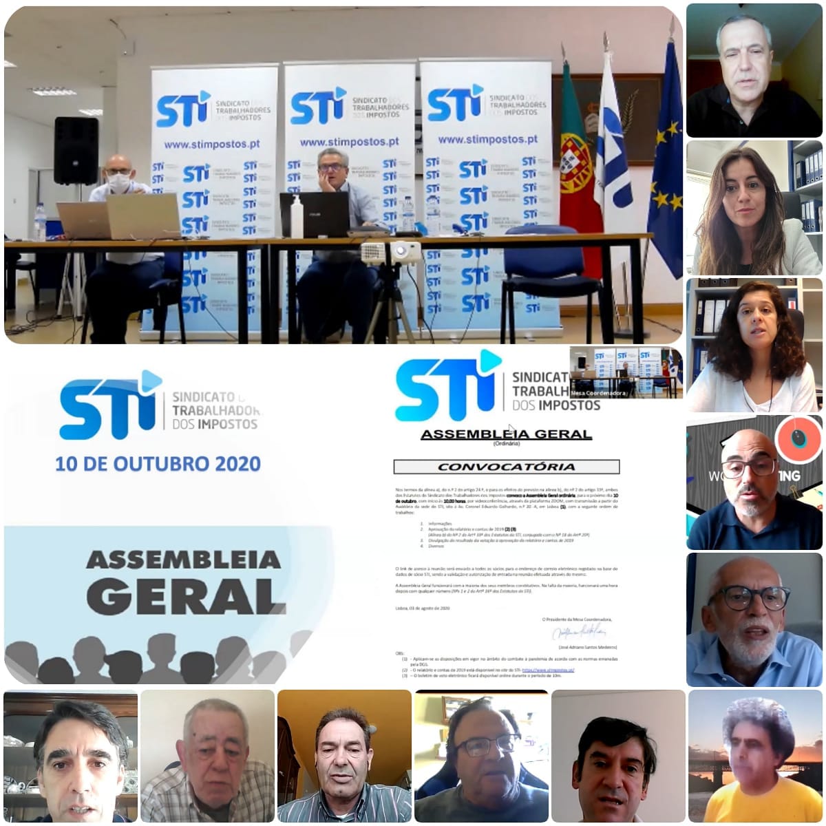 Foi convocada a Assembleia Geral Ordinária, para o dia 10 de outubro de 2020, com início às 10,00 horas, por videoconferência, através da plataforma ZOOM, com transmissão a partir do Auditório da sede do STI, sito à Av. Coronel Eduardo Galhardo, n.º 20 -A, em Lisboa, nos termos da alínea a), do n.º 2 do artigo 24.º, e para os efeitos do previsto na alínea b), do nº 2 do artigo 33º, ambos dos Estatutos do Sindicato dos Trabalhadores dos Impostos.