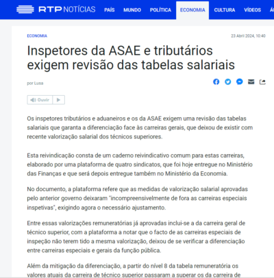 RTP Notícias | Inspetores da ASAE e tributários exigem revisão das tabelas salariais