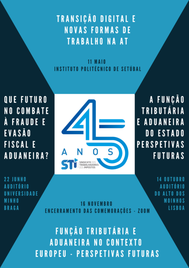 No âmbito das comemorações do seu 45.º Aniversário, o STI – Sindicato dos Trabalhadores dos Impostos está a desenvolver um Ciclo de Conferências sobre o futuro do trabalho na Autoridade Tributária e Aduaneira, onde se pretende abordar vários temas relacionados com a nossa atividade e as nossas funções, numa ótica de perspetivar o futuro que nos aguarda enquanto trabalhadores de uma das mais importantes organizações da Administração Pública.