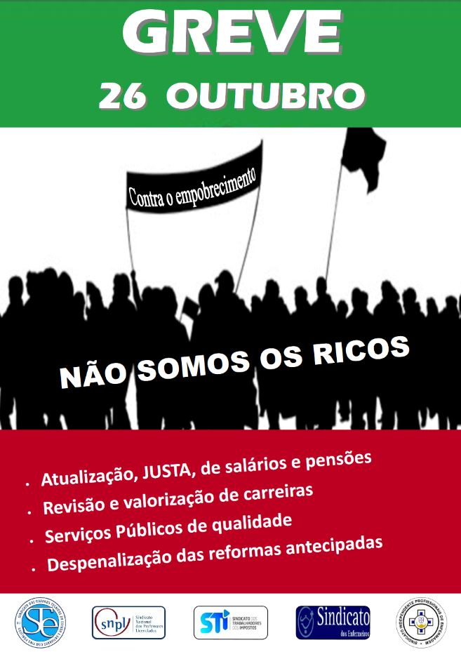 O STI apresentou, em conjunto com a Frente Sindical informal que integra com o STE, o SNPL, o SE e o SIPE, á semelhança aliás de praticamente todas as estruturas sindicais representantes dos Trabalhadores da Administração Pública, Aviso-Prévio de greve para o dia 26 de outubro próximo.