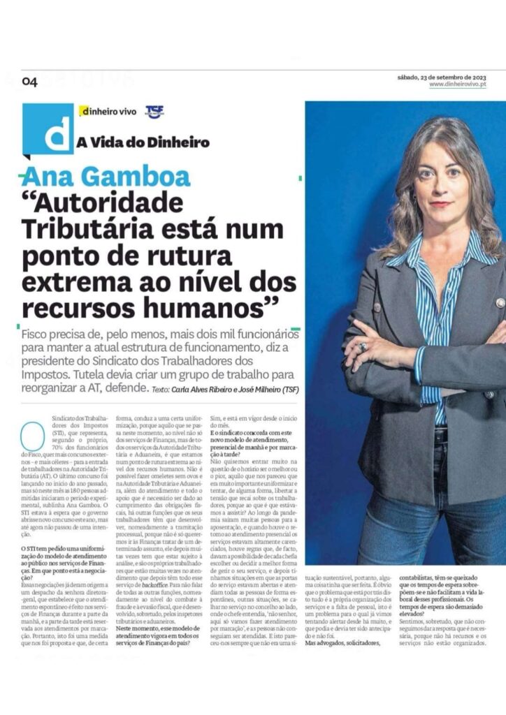 Não cabe ao sindicato estabelecer esses pilares. Aquilo que nos parece é que, como está, não está a funcionar de forma eficiente nem para os utentes do nosso serviço, nem para os trabalhadores. E temos esta questão da rutura dos quadros em cima da mesa. E, por outro lado, não obstante esteja a ser feito algum esforço de modernização e de aproveitamento das tecnologias, da digitalização, parece-nos que com as ferramentas como o teletrabalho e a evolução tecnológica, eventualmente há aqui condições para que alguma equipa de trabalho dirigente promova e repense a forma de funcionamento da AT, de maneira que seja mais eficiente no serviço que presta, tendo sempre em conta as condições com que os seus trabalhadores exercem a sua função.