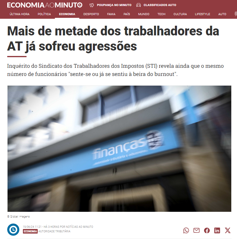 Mais de metade dos funcionários da Autoridade Tributária e Aduaneira (AT), concretamente 60%, já sofreu agressões físicas ou verbais no exercício das suas funções, revelou esta quarta-feira o Sindicato dos Trabalhadores dos Impostos (STI), num comunicado enviado ao Notícias ao Minuto.