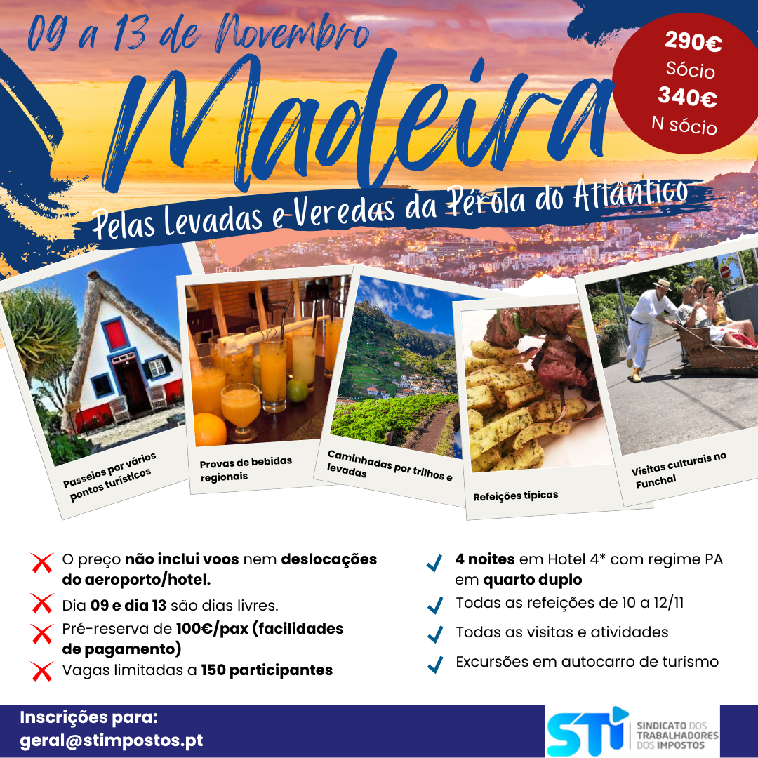 O Sindicato dos Trabalhadores dos Impostos está a organizar um Encontro Nacional para sócios na ilha da Madeira, entre os dias 09 e 13 de Novembro/23, com vista a proporcionar momentos de convívio, animação e cultura!