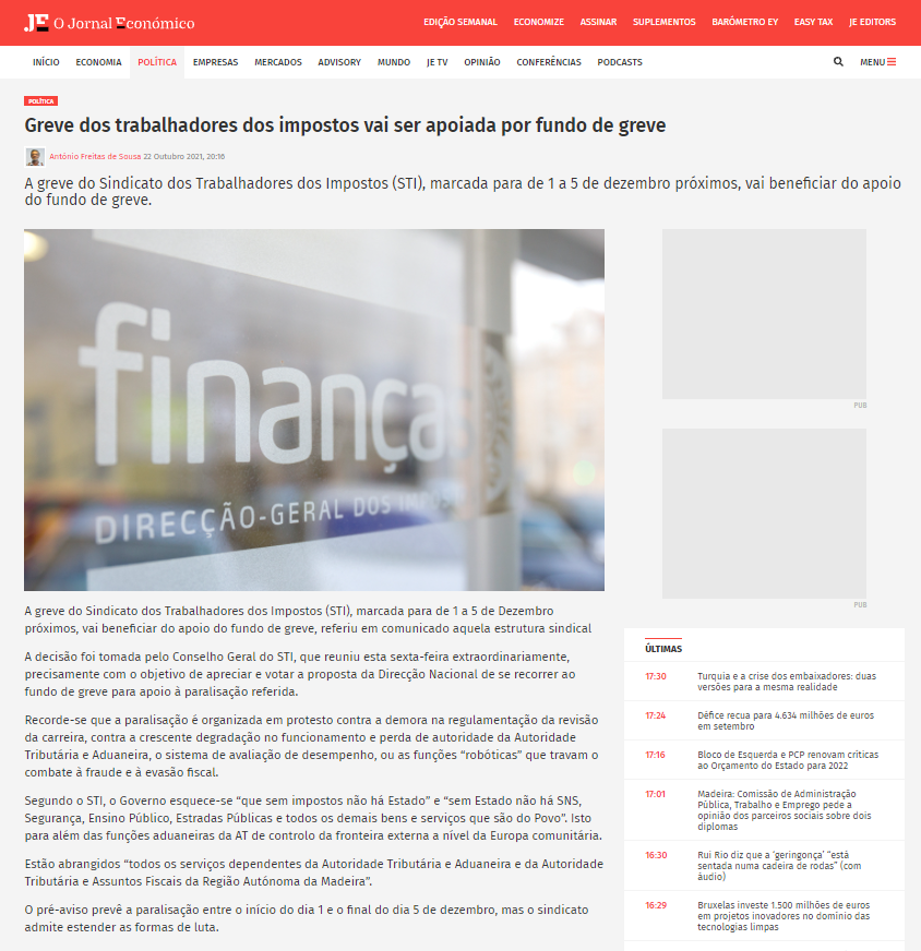 Recorde-se que a paralisação é organizada em protesto contra a demora na regulamentação da revisão da carreira, contra a crescente degradação no funcionamento e perda de autoridade da Autoridade Tributária e Aduaneira, o sistema de avaliação de desempenho, ou as funções “robóticas” que travam o combate à fraude e à evasão fiscal.