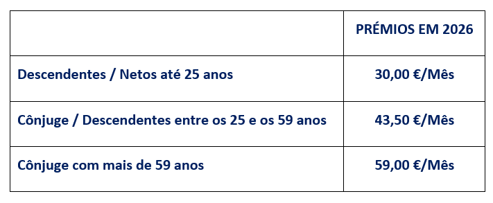 Os prémios para 2026, face às razões referidas na introdução tiveram um ligeiro aumento, mais relevante nos escalões etários onde se verificou maior sinistralidade, apesar de tudo muito inferior à taxa de inflação dos custos com a saúde, são: