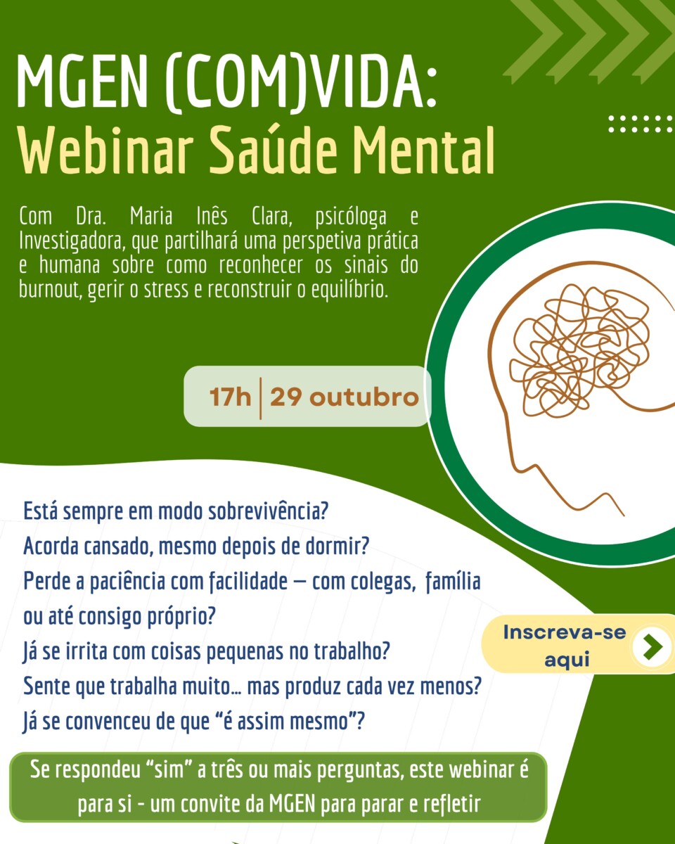 É com este propósito que a MGEN lança o webinar “MGEN (COM)VIDA: Saúde Mental”, um espaço de reflexão e partilha com a Dra. Maria Inês Clara, psicóloga e investigadora, membro da equipa de Psicologia da Knok, que irá oferecer uma perspetiva prática e humana sobre como reconhecer os sinais de burnout, gerir o stress e reconstruir o equilíbrio.