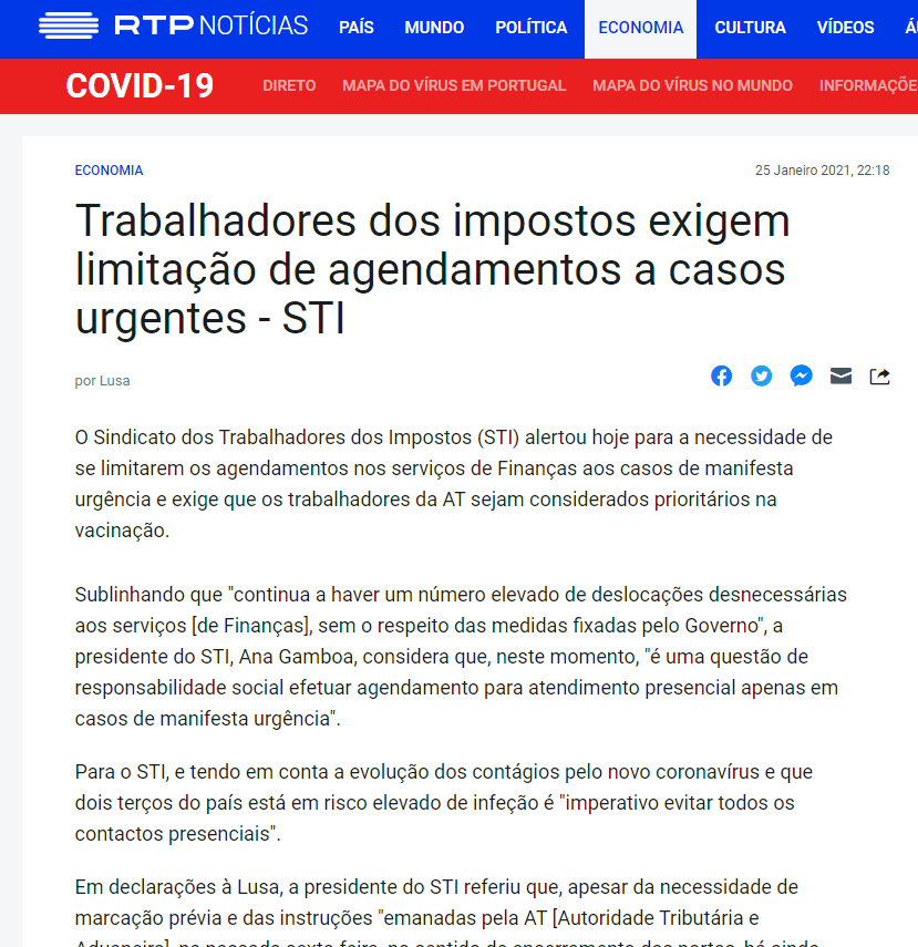 O Sindicato dos Trabalhadores dos Impostos (STI) alertou hoje para a necessidade de se limitarem os agendamentos nos serviços de Finanças aos casos de manifesta urgência e exige que os trabalhadores da AT sejam considerados prioritários na vacinação.