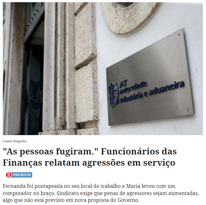 Para o presidente do Sindicato dos Trabalhadores dos Impostos (STI), Gonçalo Rodrigues, é o facto destes trabalhadores serem agredidos “diariamente” que justifica o seu apelo a que estes funcionários sejam incluídos na nova proposta de lei que será apresentada pelo Governo no Parlamento e que prevê o aumento das penas contra os agressores de funcionários públicos. Só foram abrangidos as forças de segurança, pessoal docente e não docente, guardas prisionais e profissionais de saúde.