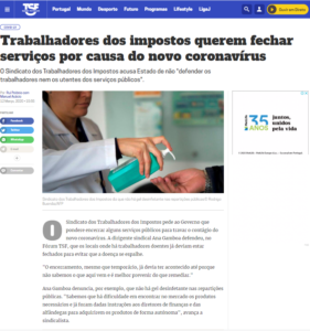 «O Sindicato dos Trabalhadores dos Impostos pede ao Governo que pondere encerrar alguns serviços públicos para travar o contágio do novo coronavírus. A dirigente sindical Ana Gamboa defendeu, no Fórum TSF, que os locais onde há trabalhadores doentes já deviam estar fechados para evitar que a doença se espalhe. “O encerramento, mesmo que temporário, já devia ter acontecido até porque não sabemos o que aqui vem e é melhor prevenir do que remediar.” Ana Gamboa denuncia, por exemplo, que não há gel desinfetante nas repartições públicas. “Sabemos que há dificuldade em encontrar no mercado os produtos necessários e já foram dadas instruções aos diretores de finanças e das alfândegas para adquirirem os produtos de forma autónoma”, avança a sindicalista.» Ver notícia AQUI