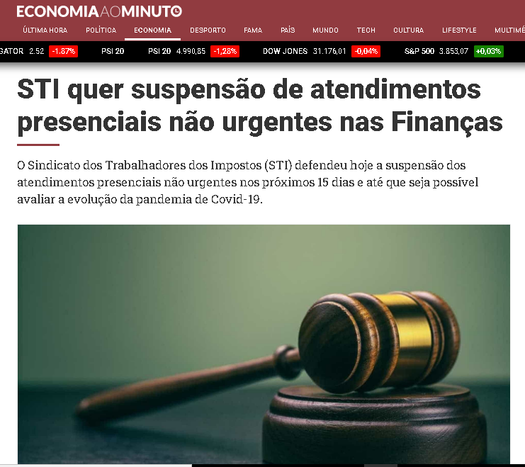 O Sindicato dos Trabalhadores dos Impostos (STI) defendeu hoje a suspensão dos atendimentos presenciais não urgentes nos próximos 15 dias e até que seja possível avaliar a evolução da pandemia de Covid-19.