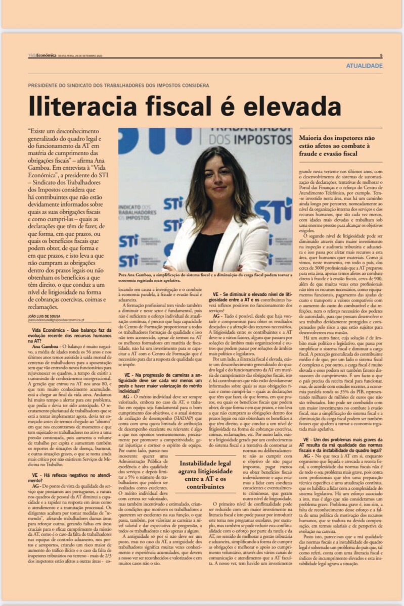 Existe um desconhecimento generalizado do quadro legal e do funcionamento da AT em matéria de cumprimento das obrigações fiscais” – afirma Ana Gamboa. Em entrevista à “Vida Económica”, a presidente do STI – Sindicato dos Trabalhadores dos Impostos considera que há contribuintes que não estão devidamente informados sobre quais as suas obrigações fiscais e como cumpri-las – quais as declarações que têm de fazer, de que forma, em que prazos, ou quais os benefícios fiscais que podem obter, de que forma e em que prazos, e isto leva a que não cumpram as obrigações dentro dos prazos legais ou não obtenham os benefícios a que têm direito, o que conduz a um nível de litigiosidade na forma de cobranças coercivas, coimas e reclamações.