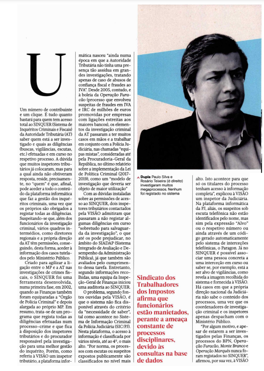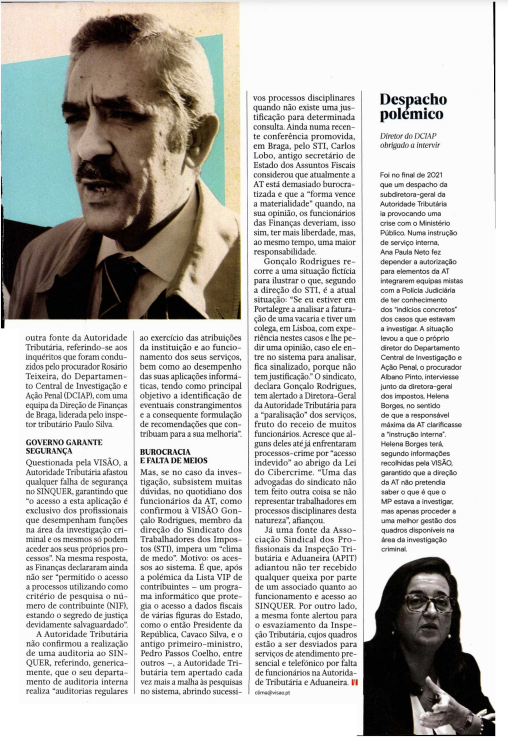 Mas, se no caso da investigação subsistem muitas dúvidas, no quotidiano dos funcionários da AT, como confirmou à VISÃO Gonçalo Rodrigues, membro da direção do Sindicato dos Trabalhadores dos Impostos (STI), impera um “clima de medo”. Motivo: os acessos ao sistema. É que, após a polémica da Lista VIP de contribuintes – programa informático que protegia o acesso a dados fiscais de várias figuras do Estado, como o então Presidente da República, Cavaco Silva, e o antigo primeiro-ministro, Pedro Passos Coelho, entre outros – a, Autoridade Tributária tem apertado cada vez mais a malha às pesquisas no sistema, abrindo sucessivos processos disciplinares quando não existe uma existe uma justificação para determinada consulta. Ainda numa recente conferência promovida, em Braga, pelo STI, Carlos Lobos, antigo secretário de Estado dos Assuntos Fiscais considerou atualmente a AT está demasiado burocratizada e que a “forma vence a materialidade” quando, na sua opinião, os funcionários das Finanças deveriam, isso sim, ter mais liberdade, mas, ao mesmo tempo, uma maior responsabilidade.