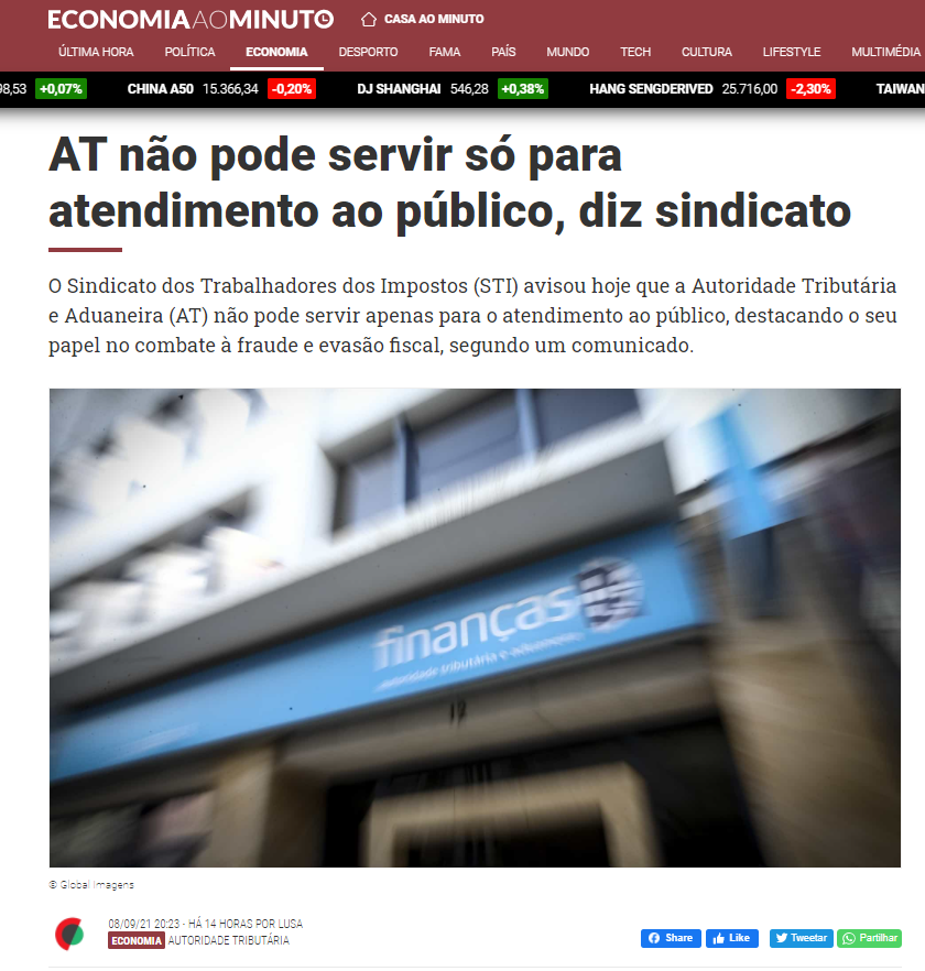 Em reação à entrevista à Lusa do subdiretor-geral da área da Relação com o Contribuinte da AT, Nuno Félix, onde este indicou que a AT respondeu, através do e-balcão, a mais de 700 mil questões no primeiro semestre deste ano, o que traduz uma subida de 250% face ao semestre homólogo de 2019, o STI diz que “isto mostra bem como os trabalhadores da AT se dedicam ao serviço público”.